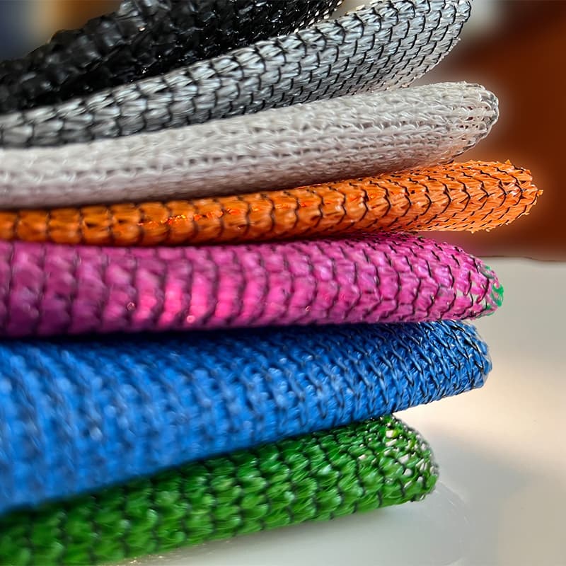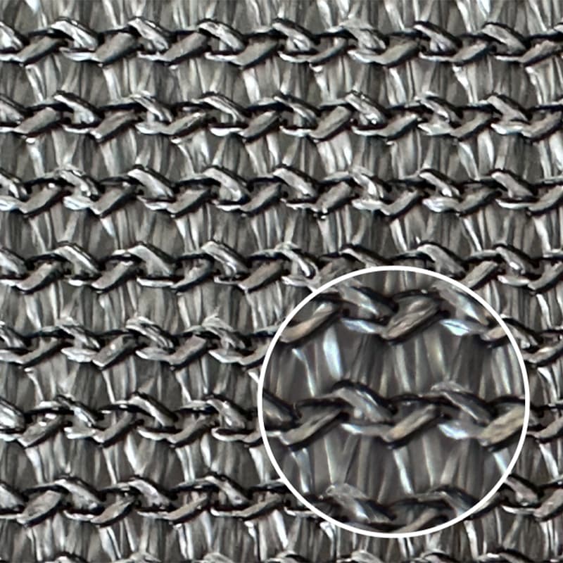 三冠牌圓扁針織網 RF 級,經紗是圓紗 0.25mm 單絲,緯紗是扁紗 450d,半圓半扁自然安,半厚半薄實自強。半耐用半遮蔽是創新。添加抗 UV 可延長使用壽命如虎添翼,透氣性佳、耐撕、耐磨。